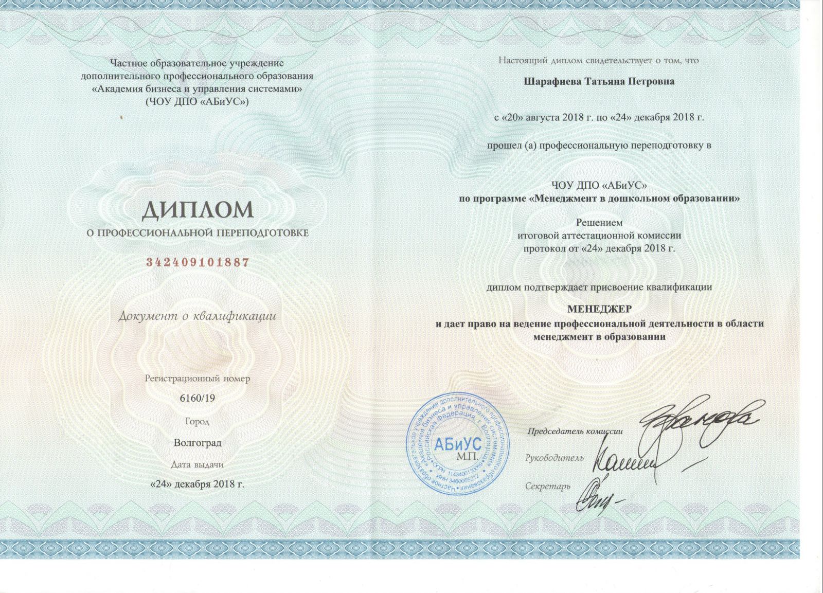 1. Шарафиева Т.П. - "Менеджмент в дошкольном образовании" 2018г. 510 часов.