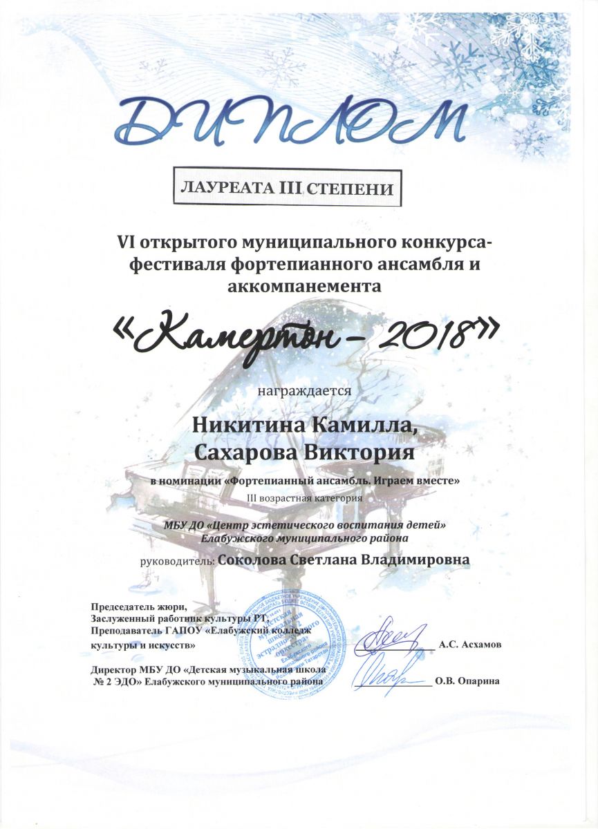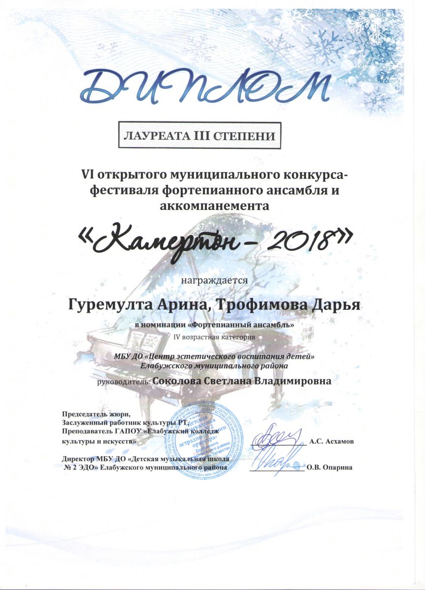 VI открытый муниципальный конкурс – фестиваля фортепианного ансамбля и аккомпанемента «Камертон -2018» |