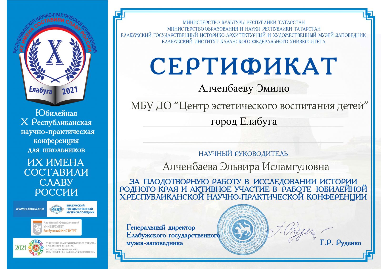 Опубликовано: 25.03.2021В ЕГМЗ состоялось торжественное награждение участникоа Х научно практической конференции среди школьников "Их имена славили славу России".Среди них были и наши воспитанники ЦЭВД Алченбаев Эмиль и Айкашева Эльга.