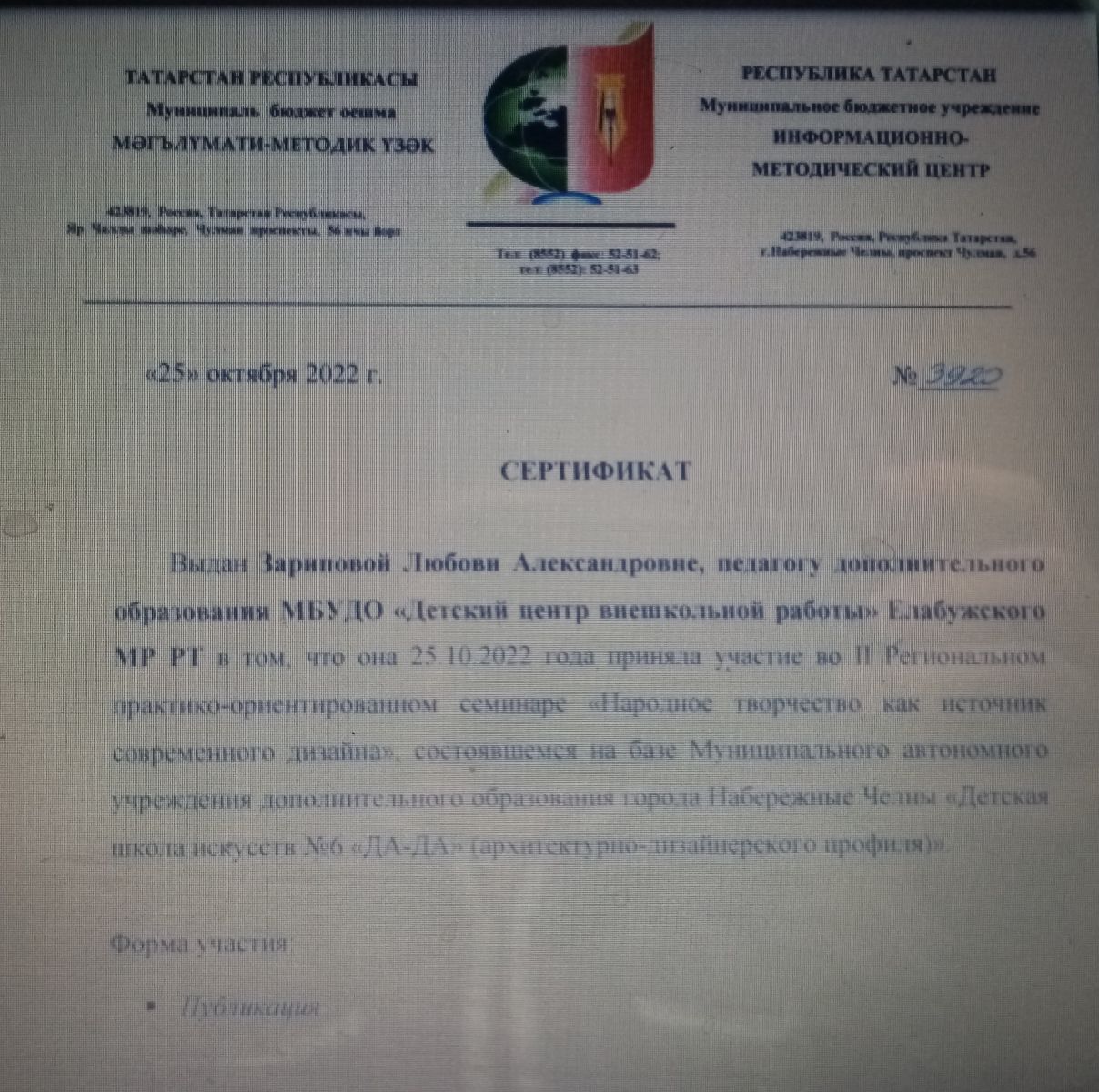 Сертификат участника Региональный Зарипова ЛА