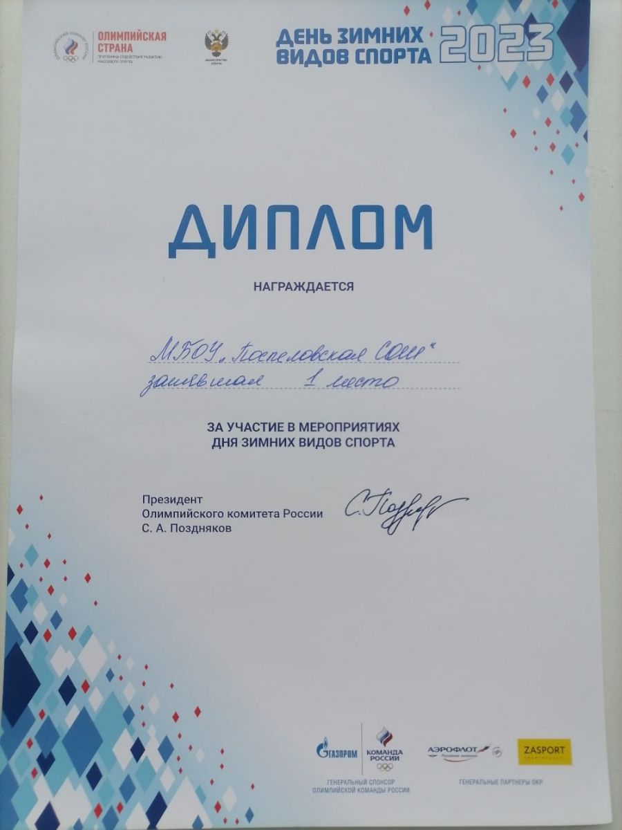 Грамота 1 место Первенство по зимним видам спорта