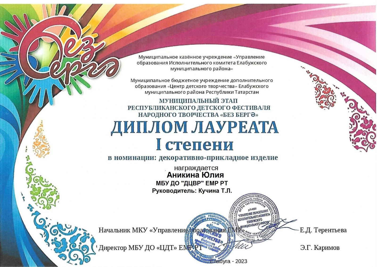 Диплом 1 ст Муниципальный этап Без бергә Аникина Юлия