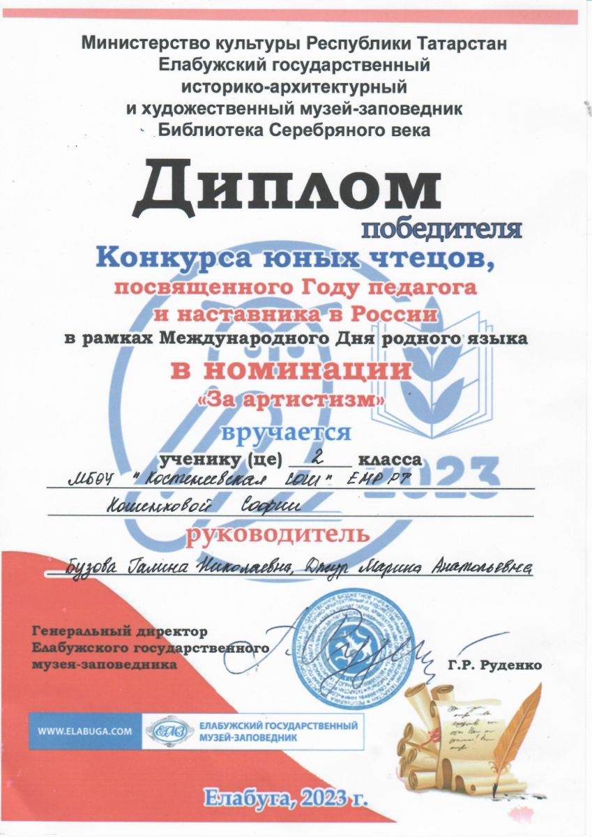 Диплом победителя Кошенкова София