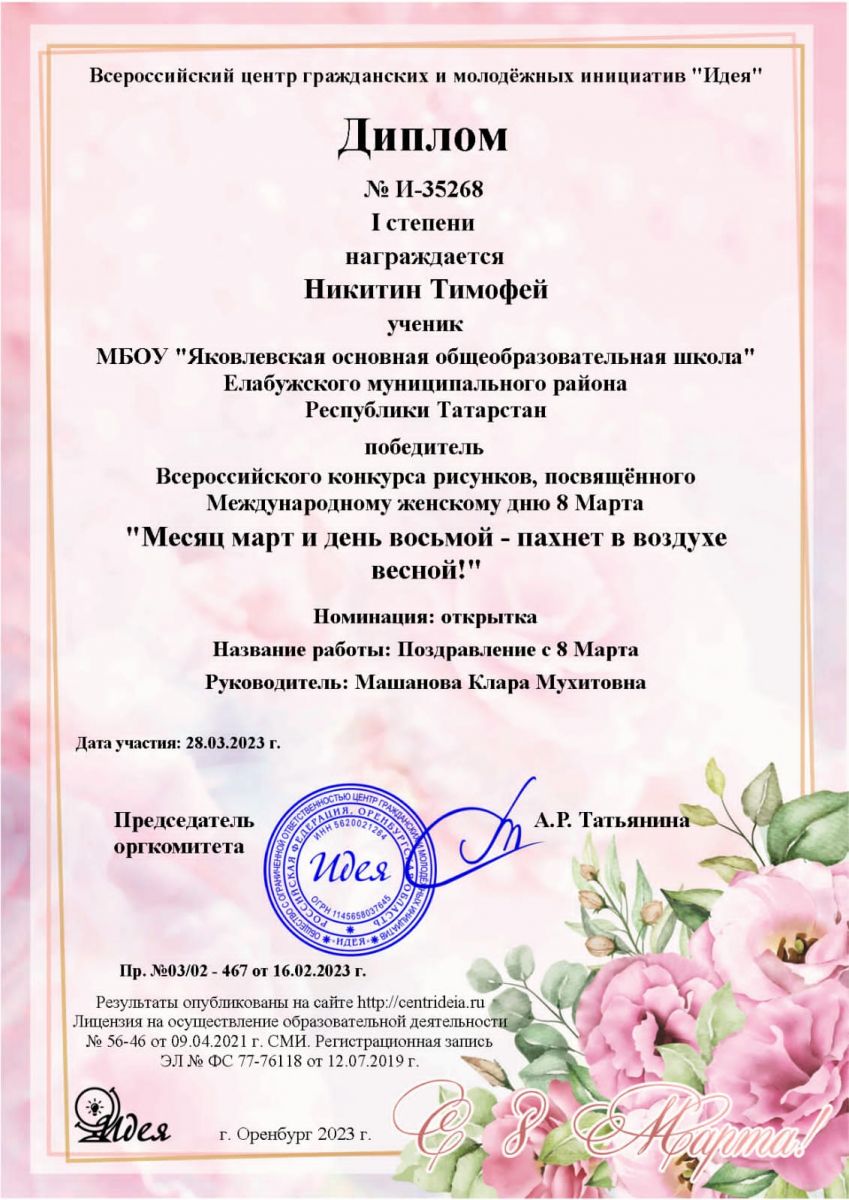 Диплом 1 ст Всероссийский Никитин Тимофей