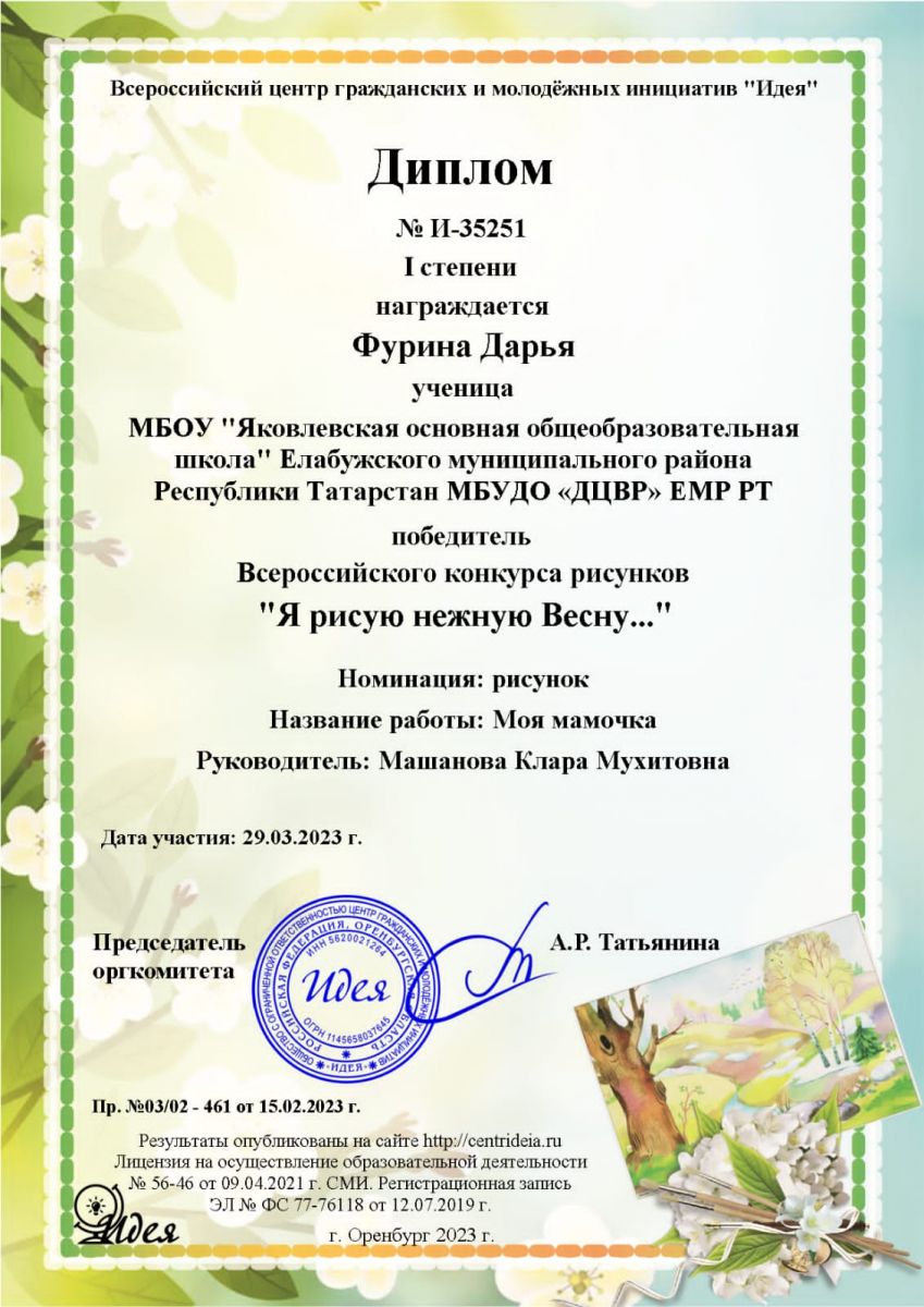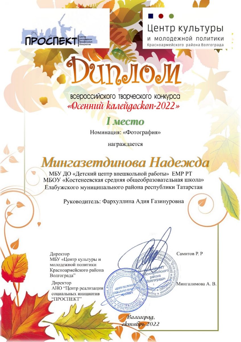 Диплом 1 степени Всероссийский Мингазетдинова Надежда