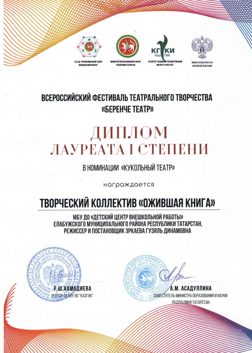 Диплом лауреата 1 степени Коллетив Ожившая книга Беренче театр 2022