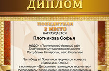 Плотникова Софья, воспитанница нашего детского сада, принимала участие в I Зональном творческом конкурсе «Затейница – Осень», и была награждена дипломом победителя (2 место) в номинации «Декоративно прикладное творчество».
