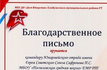 Отряд командиры Бятикова Кира һәм отряд командиры урынбасары Гыйльванова Айзилә Алабуга муниципаль районында «Юнармия» Бөтенроссия балалар-яшүсмерләр хәрби-патриотик иҗтимагый хәрәкәте чараларында актив катнашканнары өчен Юнармия йортыннан рәхмәт хатлары алдылар .