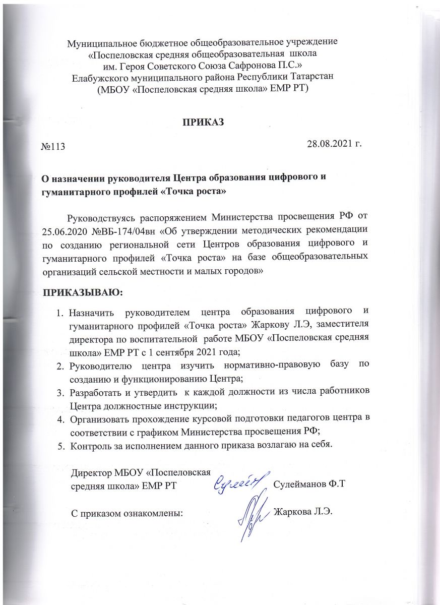 Положение о центре образования естественно-научной и технологической направленности "Точка роста" на базе МБОУ "Поспеловская СОШ" ЕМР РТ