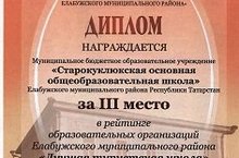 По итогам 2018-2019 учебного года наша школа заняла 3 место в рейтинге среди образовательных организаций Елабужского муниципального района и награждена Дипломом в номинации «Лучшая туристическая школа. Поздравляем!