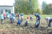Бүген мәктәп хезмәткәрләре, укучылар мәктәп яны тәҗрибә участогында үтерелгән бәрәңге уңышын җыеп алдылар. -