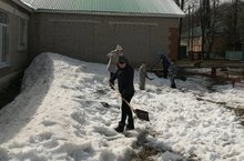 Карга эрергә булышабыз/ Помогаем снегу таить. 08.04.2021 Бакчабыз почмакларында эреп бетмәгән карларны балалар берлектә таратырга чыктык./ Вместе с детьми раскидали снег.