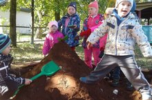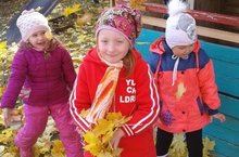 Средник оештырдык. Балалар белән берлектә коелган яфракларны җыйдык./Организовали средник. Сотрудники вмести с детьми собрали опавшие листья.