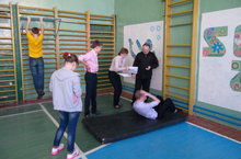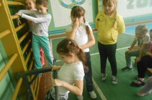 Девочки 1Б класса выполняли подтягивание из виса лёжа на низкой перекладине. На серебряный значок, в возрастной группе от 6 до 8 лет, сдали Косинцева Яна. Её результат 9 раз. Козлова Дарья - результат 7 раз.