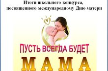 В преддверии празднования Международного Дня матери в школе был объявлен творческий конкурс "Пусть всегда будет мама", который предлагал ребятам приготовить своим мамам подарки в виде чтения стихотворения или личного посвящения стихотворения, эссе или сочинения, создания рисунка - портрета мамы, оформления поздравительной открытки, как в традиционном, так и в электронном виде, и, конечно же, самого подарка для мамы.