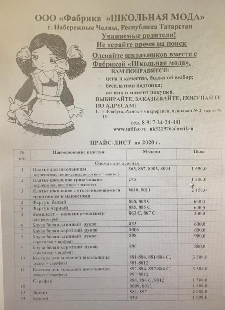 Школьную форму нашей школы можно приобрести по адресу г.Елабуга, рынок 6 мкр., пав.№2, место №13.
