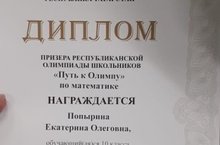 Поздравляем призера республиканской олимпиады школьников «Путь к олимпу» по математике ученицу 10А класса Попырину Екатерину.