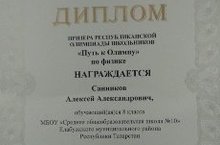 Поздравляем призера республиканской олимпиады школьников «Путь к олимпу» по физике ученика 8Б класса Санникова Алексея Александровича. Огромное спасибо учителю физики Кузнецовой Елене Александровне, подготовившего ученика.