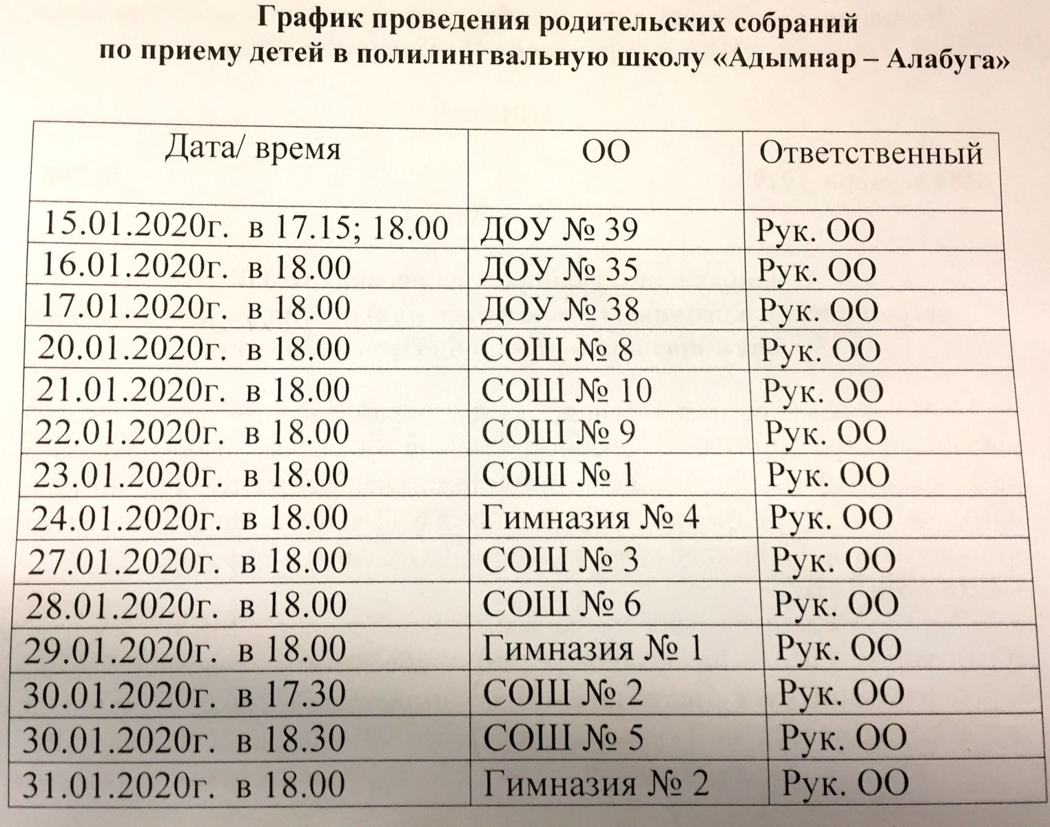 График проведения родительских собраний по приему детей в полилингвальную школу "Адымнар- Алабуга" 15.01.2020