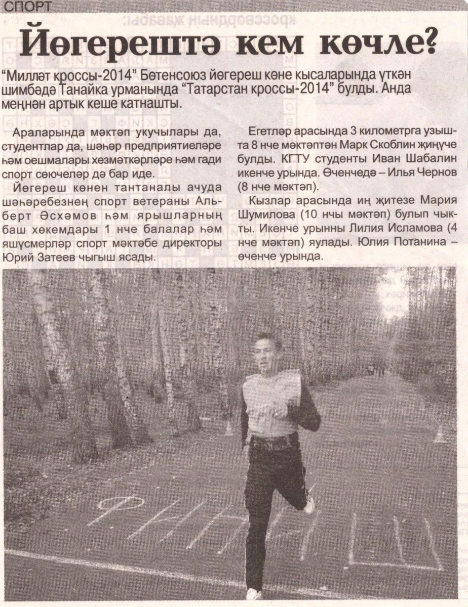 ► Йөгерештә кем көчле? // Алабуга нуры. - 2014. - 1 октябрь - Кросс Татарстана - 2014: Среди девушек победу одержала ученица нашей школы Шумилова Мария Посмотреть