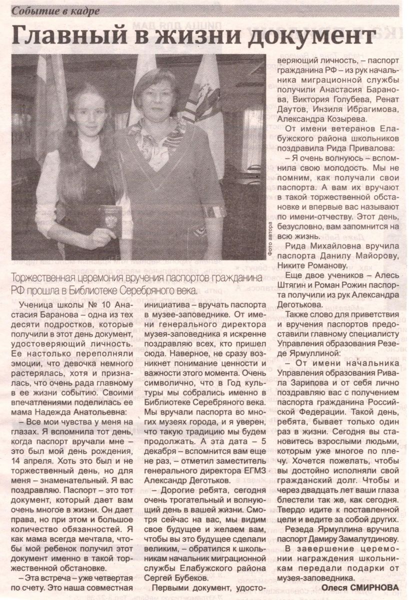 ► Смирнова О. Главный в жизни документ: О торжественной церемонии вручения паспортов учщимися, достигшим 14 лет // Новая Кама. - 2014. - 10 декабря. Посмотреть