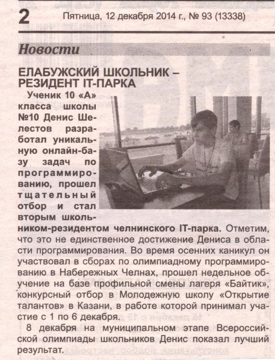 ►Елабужский школьник - резидент IT-парка: О достижениях ученика 10А класса Шелестова Дениса // Новая Кама. - 2014 - 12 декабря. Посмотреть