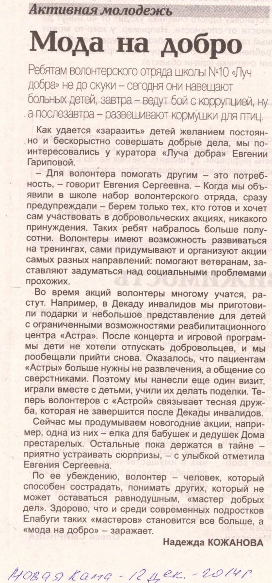 ►Кожанова Н. Мода на добро: О деятельности школьного волонтерского отряда "Луч добра" // Новая Кама. - 2014. - 12 декабря Посмотреть