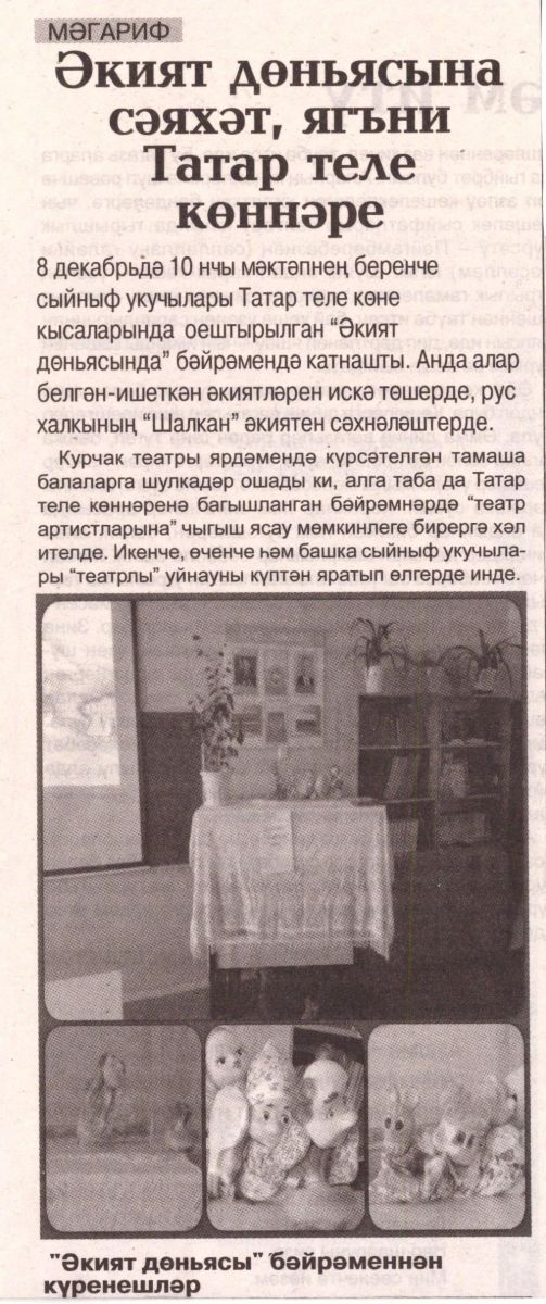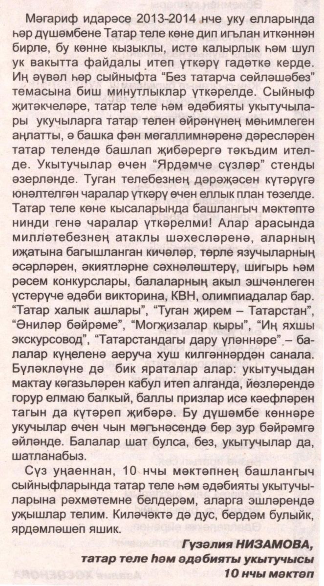 ►Низамова Г. Əкият дөньясына сәяхәт, ягъни Татар теле көннәре // Алабуга нуры. - 2014. - 19 декабрь. - Учитель татарского языка в начальных рассказала о проведенных мероприятиях в рамках Дня татарского языка Посмотреть , продолжение