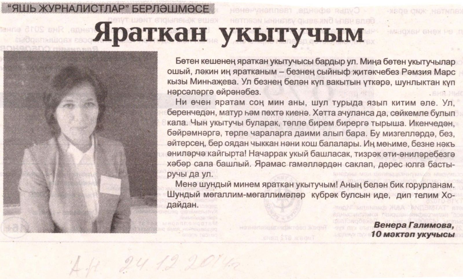►Галимова В. Яраткан укытучым // Алабуга нуры. - 2014. - 24 декабрь. - Ученица 9М класса о своем классном руководителе Мингазовой Р.М. Посмотреть