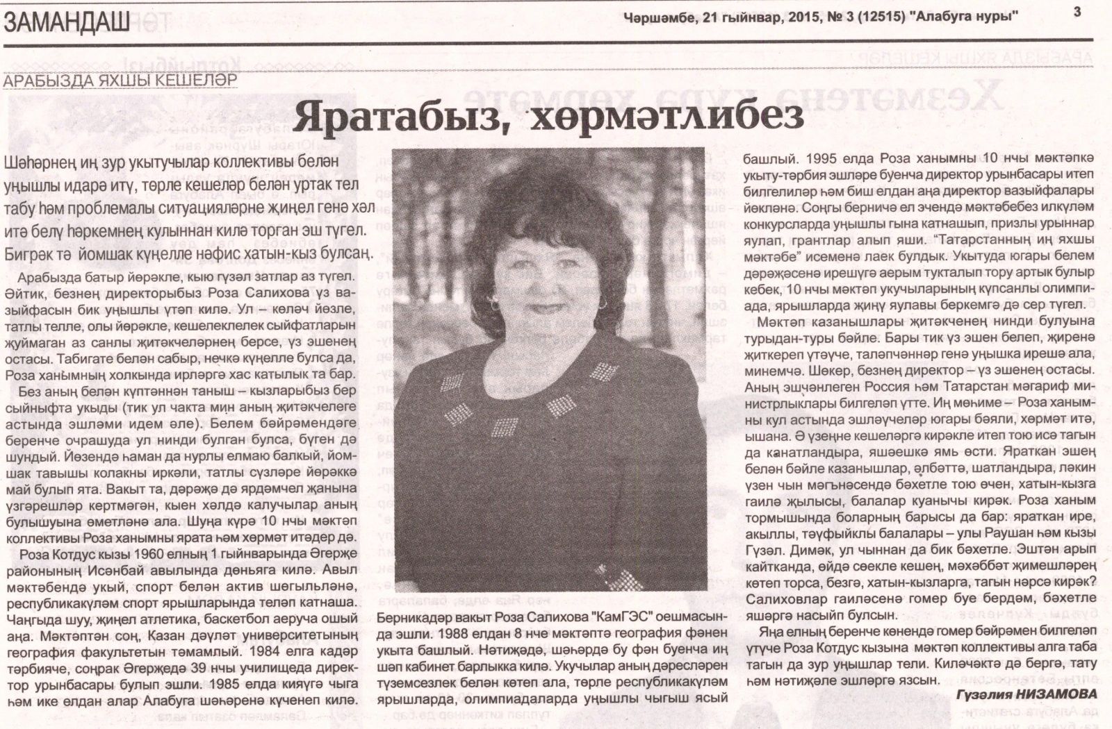 ► Низамова Г. Яратабыз, хөрмәтлибез // Алабуга нуры. - 2015. - 21 гыйнварь - Статья посвящена директору школы Салиховой Розе Кутдусовне Посмотреть