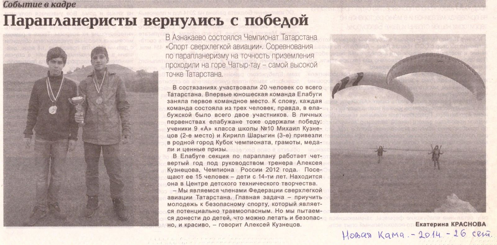 ►Краснова Е. Парапланеристы вернулись с победой: В Азнакаево состоялся Чемпионат Татарстана "Спорт сверхлегкой авиации", на котором ученики 9А класса в личных первенствах одержали победу // Новая Кама. - 2014. - 26 сентября Посмотреть