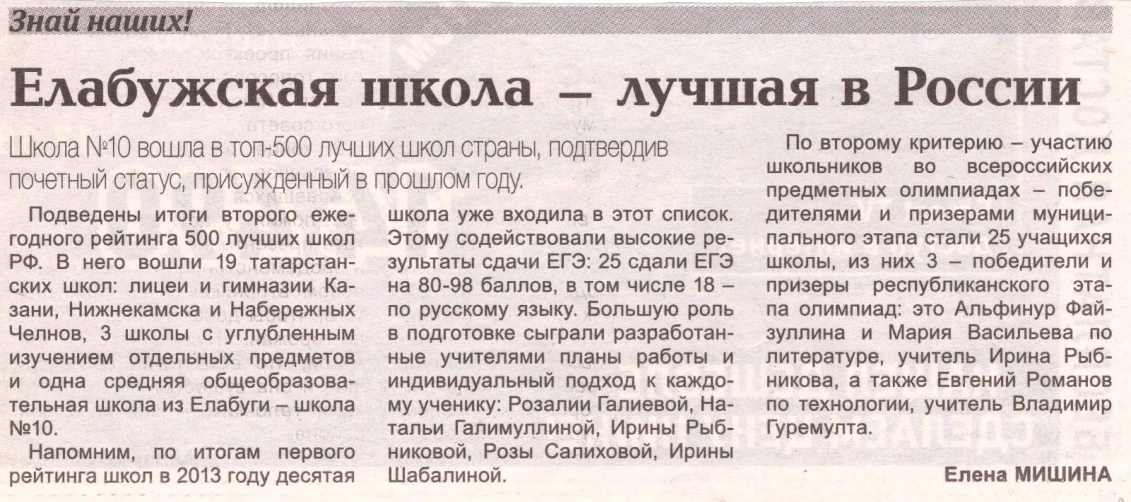 ► Мишина Е. Елабужская школа - лучшая в России: Школа вошла в ТОП-500 лучших школ страны, подтвердив почетный статус, присужденный в прошлом году // Новая Кама. - 2014. - 3 октября Посмотреть
