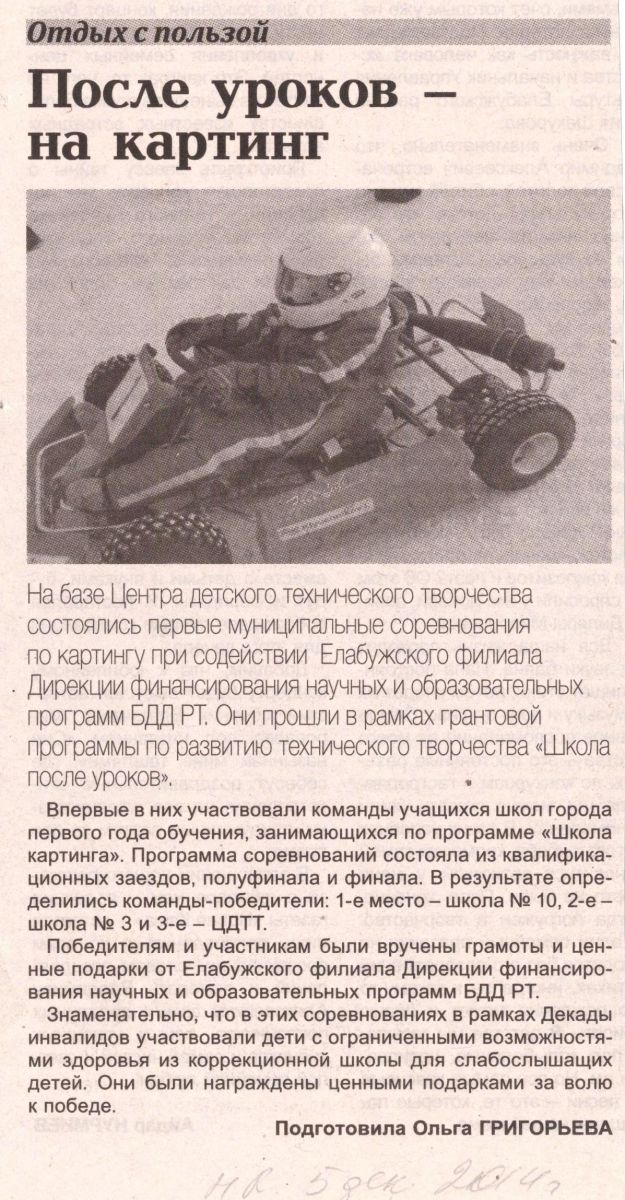 ►Григорьева О. После уроков на картинг: команда школы - победитель первых муниципальных соревнований по картингу // Новая кама. - 2014. - 5 декабря Посмотреть