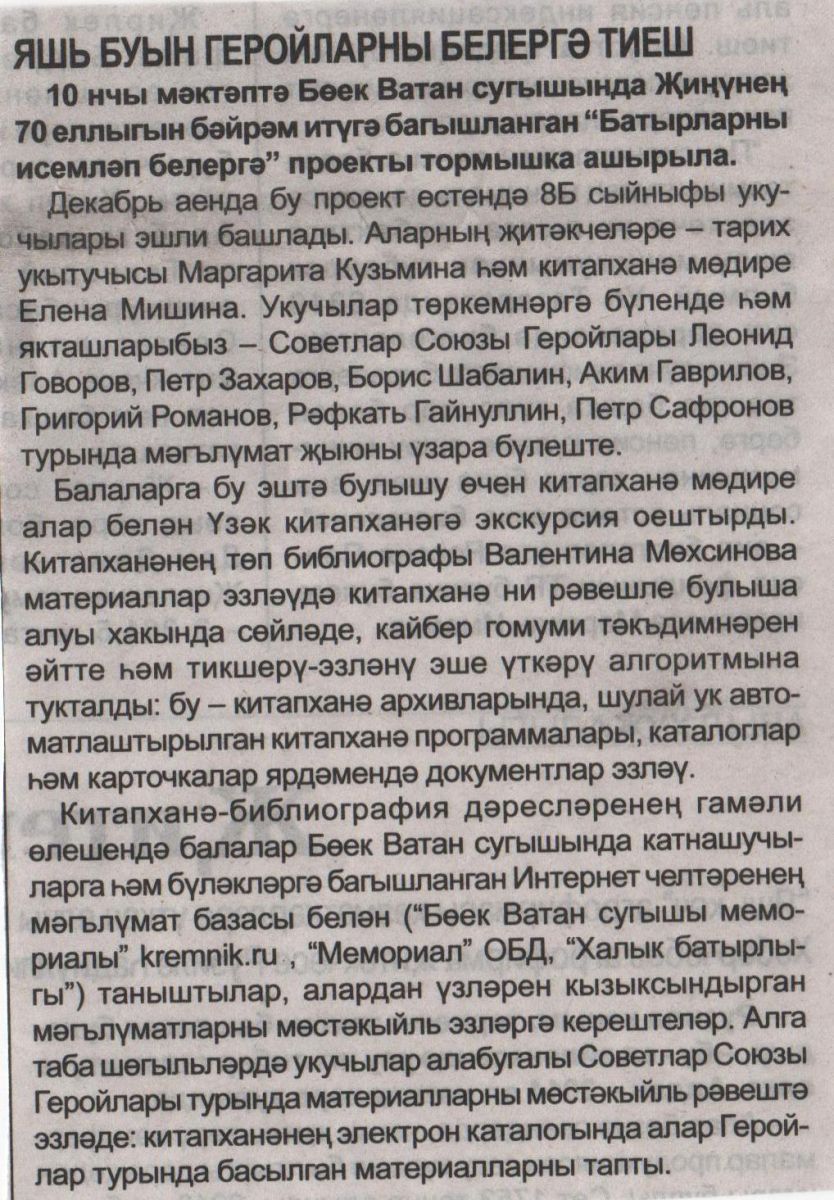 ► Яшь буын геройларны белергǝ тиеш // Алабуга нуры. - 2015. - 30 январь - Учащиеся 8Б класса под руководством учителя истории Кузьминой М.Н. и зав.библиотеки Мишиной Е.Н. ведут проектную работу "Знать героев поименно" Посмотреть