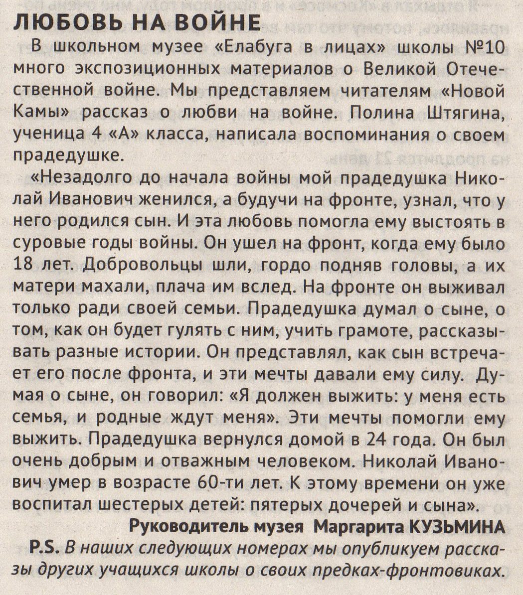 ►Кузьмина М. Любовь на войне// Новая Кама. - 2016. - июль - По материалам школьного музея "Елабуга в лицах" - Посмотреть