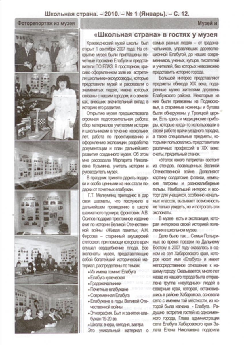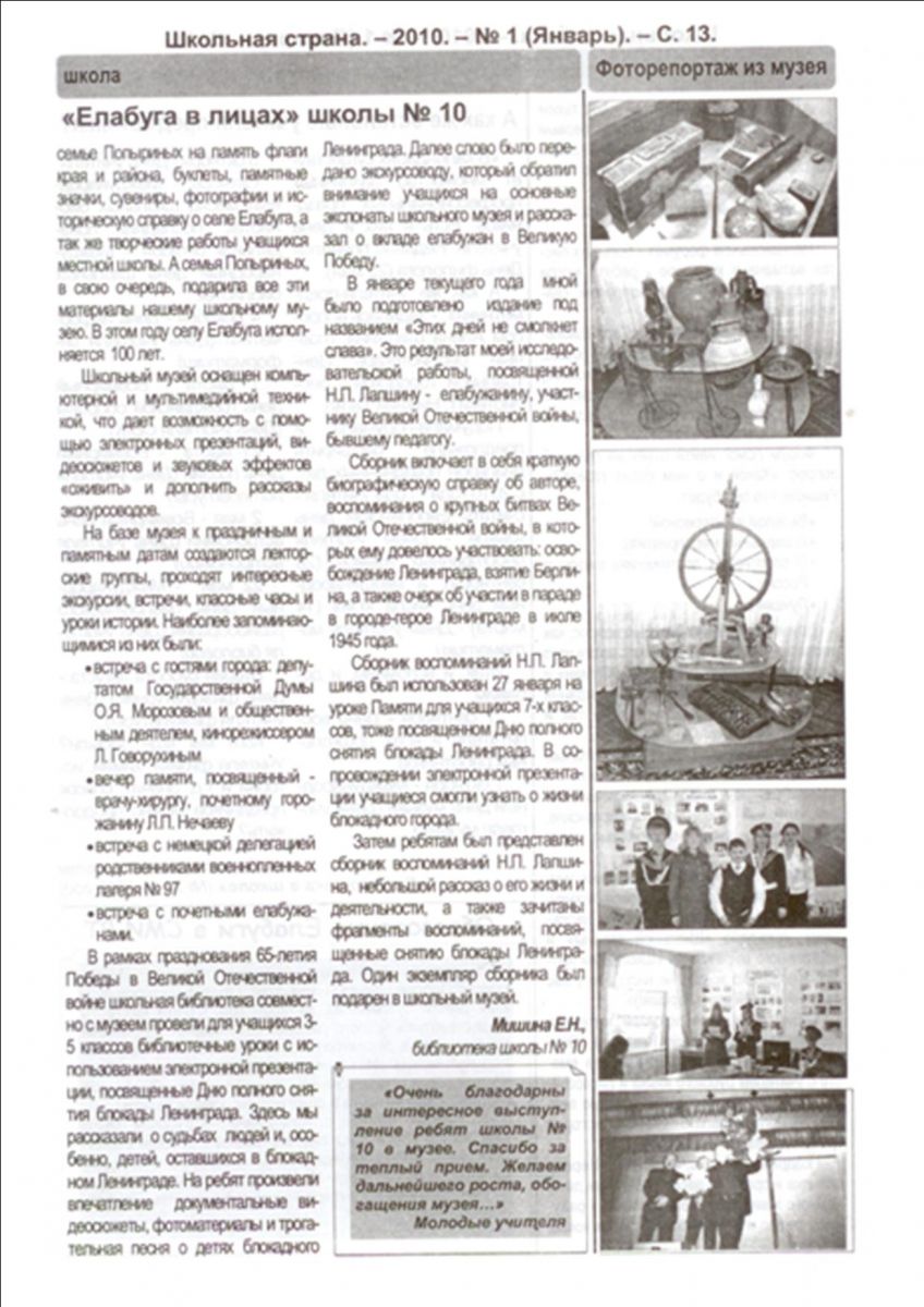 ►Мишина Е.Н. Школьная страна в гостях у музея "Елабуга в лицах" школы №10// школьная страна. - 2010. - №1. - С. 12- 13 - О работе школьного музея - Посмотреть, продолжение