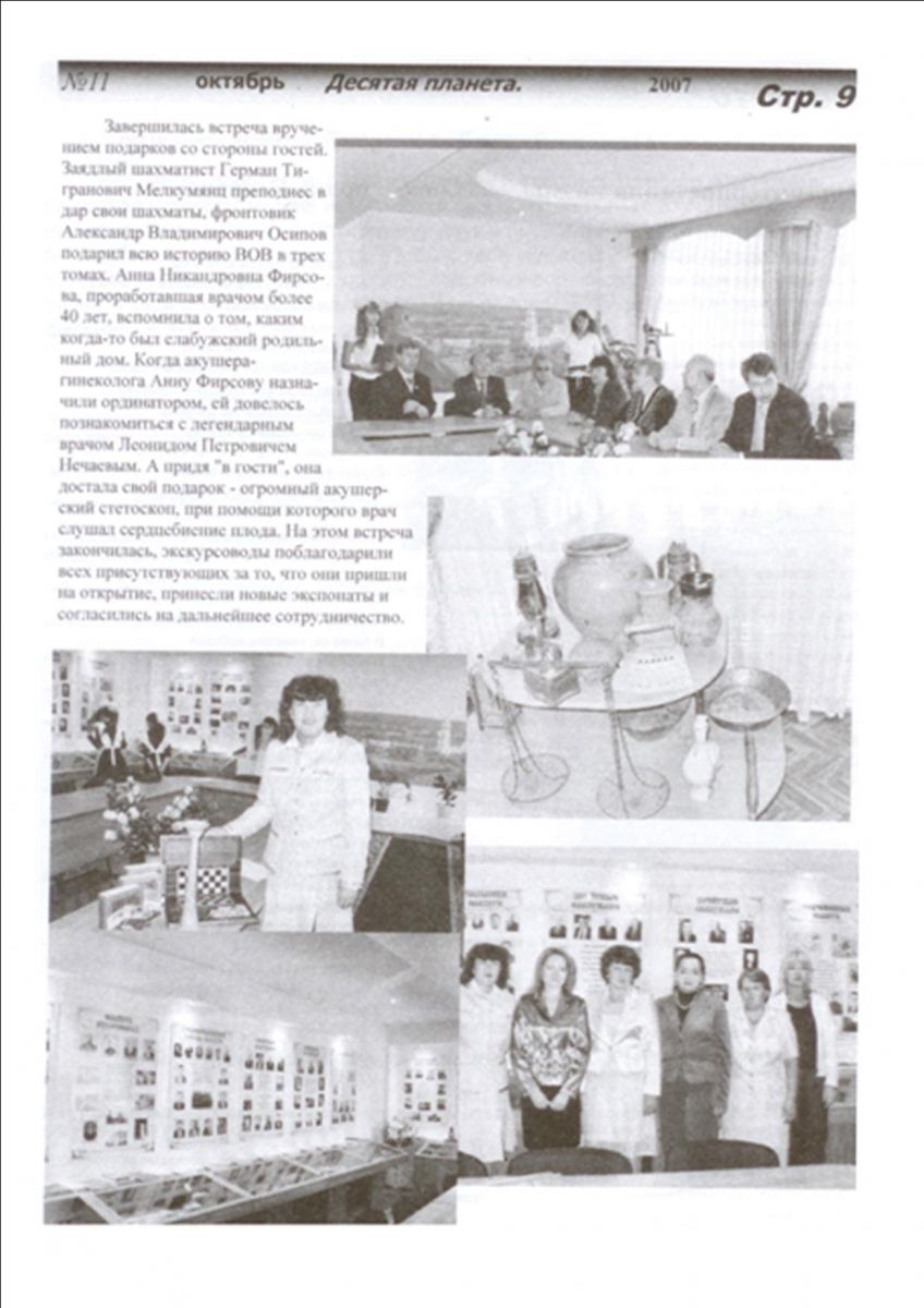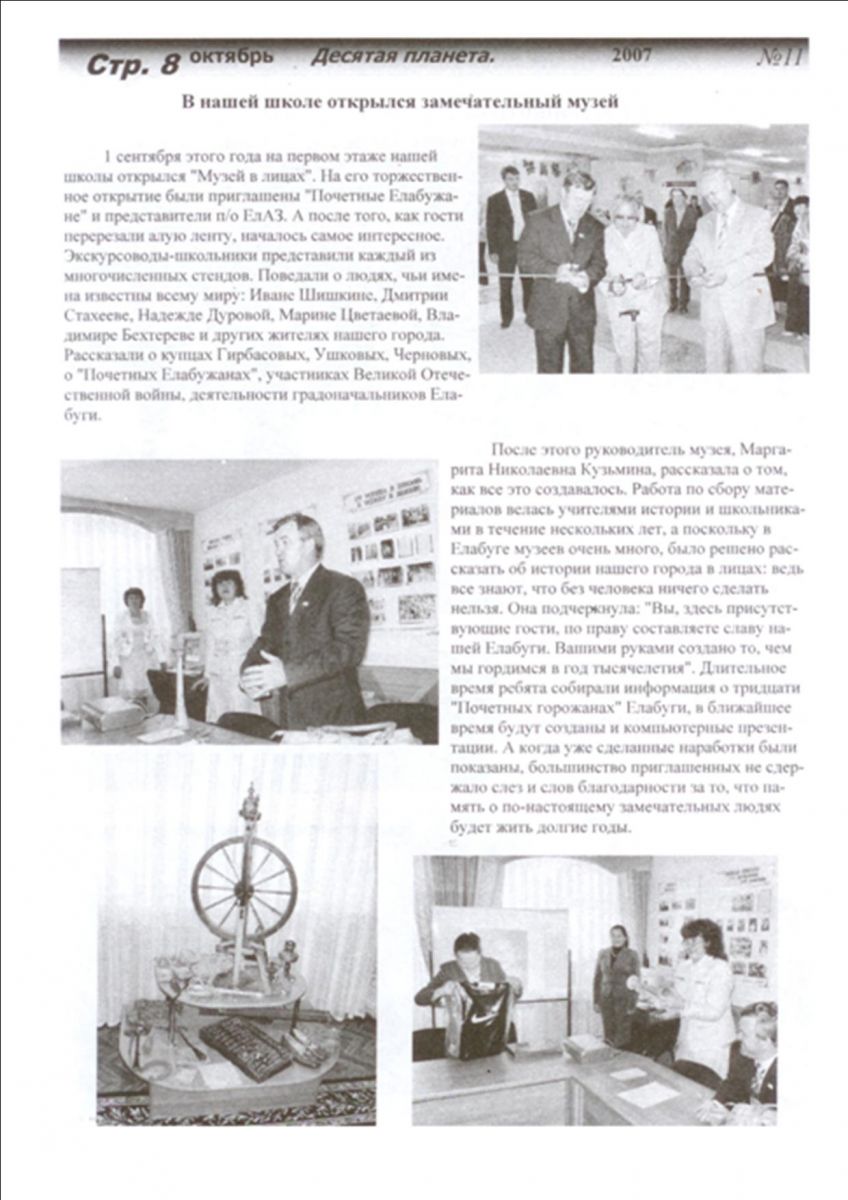 ► В нашей школе открылся замечательный музей// Десятая планета. - 2007. - № 11. - С.8 - Об открытии школьного музея "Елабуга в лицах" - Посмотреть , продолжение статьи