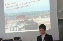 Ровно 26 лет назад, 15 февраля 1989 года, закончилась афганская война. До сих пор нет единой точки зрения политиков и историков о значимости той войны, о роли русских солдат и войск. Тем не менее, не зависимо от разных взглядов и споров, погибли люди. 14 февраля в 7К классе прошла беседа, посвященная этой знаменательной дате, цель которой способствовать формированию знаний об истории локальных конфликтов, в частности Афганской войне, гражданской позиции; воспитанию патриотизма, любви к Родине, уважения к старшему поколению, развитию кругозора, ответственности за будущее. Ребята посмотрели презентацию о выводе наших войск. -