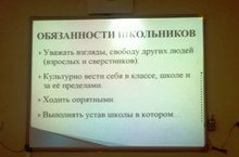 В 10 и 11 классах была проведена беседа на тему «Права и обязанности детей». Цель беседы воспитание правовой культуры учащихся. В ходе беседы учащимся напомнили о правах и обязанностях школьников и, что такие понятия как «право» и «обязанность» - едины.