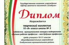 Хочется отметить спонсоров конкурса – Государственное казенное учреждение «Центр занятости населения г. Елабуги» - все участники были отмечены дипломами и сертификатами, а также получили ценные подарки. От нашей школы в конкурсе участвовали учащиеся 9 Б класса - отмечены сертификатом участника и учащиеся 10 А класса – победители в номинации 10 – 11 классов. Молодцы!!! -