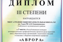 За 3 место в Республиканском конкурсе антинаркотических профилактических проектов «АВРОРА» среди кадетских школ, образовательных организаций с кадетскими классами, коллективу школы была вручена грамота и ценный подарок-фотоаппарат.