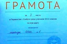 10-11 нче сыйныф укучылары арасында дартс уены буенча Алабуга шәһәре беренчелегендә 2 урын алган мәктәп җыелма командасын, шулай ук Кашеваров М. һәм Мифтахова А. А. шәхси зачетта беренчелек призерларын котлыйбыз. Җитәкчесе Мифтахова А. А. Афәрин!!!