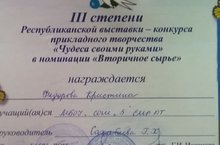 Поздравляем Федорову Кристину, занявшую III место в республикаском конкурсе-выставке прикладного творчества "Чудеса своими руками". Молодец! (Учитель Сахабиева Г.Х.).