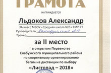 Поздравляем Льдокова Александра, занявшего II место в открытом Первенстве Елабужского муниципального района по спортивному ориентированию бегом на дистанции по выбору «Листопад -2018». Молодец!!!
