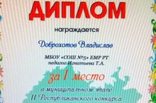 Доброхотов Владиславны “Татарстан талантлары” Республика конкурсының муниципаль этабында җиңүе белән котлыйбыз. Укытучысы Игнатьева Т.А.