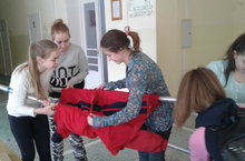 3 этап. «Изготовление носилок». Команда изготавливает мягкие носилки с помощью двух металлических жердей и трех штормовых курток.