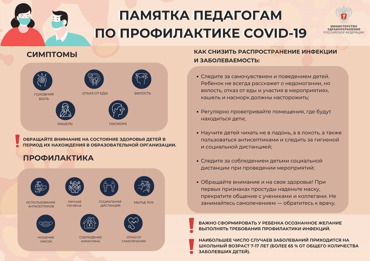 Россия Федерациясе Сәламәтлек саклау министрлыгы педагогларга коронавирусны профилактикалау буенча үз телеграм-каналында тәкъдимнәр бастырды. Нәрсә турында истә тотарга кирәк? Ковид буенча яңа белешмәлектә балалар арасында авыруның төп билгеләре: баш авырту, йөткерү, ашаудан баш тарту, ялкаулык һәм агып чыгу, диелә. Мәктәптә булган чорда балаларның сәламәтлеген күзәтергә кирәк. Әгәр дә авыру һәм башка коронавирус симптомнары сизелсә, баланы медицина профессионалына алып бару бик мөһим. Башка студентлар арасында авыруның таралу куркынычы бар.Таләпләр саклана: аларның төп өлеше мәҗбүри термометрияле «иртәнге фильтрлар» үткәрү, бу укучылар, укытучылар һәм техник персонал арасында covid-19 очракларын вакытында ачыкларга мөмкинлек бирә. Моннан тыш, ашханә хезмәткәрләренә азык әзерләгәндә һәм таратканда битлекләр һәм перчаткалар киеп йөрергә туры киләчәк.