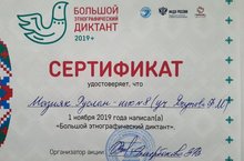 Ученик 8"А" класса Мазняк Руслан принял участие в акции "Большой этнографический диктант". (Руководитель: Якупова Ф.М.)