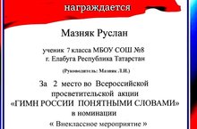2018 нче елның 20 нче октябрендә Измайл Кремле тарихи-мәдәни үзәгендәРФ Мәгариф министрлыгы ярдәме белән ата-аналар милли ассоциациясе уздырган"Россия гимны аңлаешлы сүзләр белән" Бөтенроссия акциясе җиңүчеләрен бүләкләү булды. 7а сыйныфы укучысы Мазняк Руслан призлы 2 нче урын яулады.