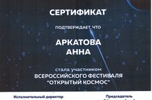 Аркатова Анна стала участником всероссийского фестиваля "Открытый космос".
